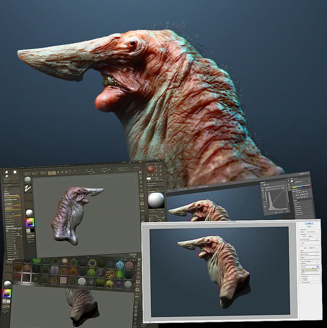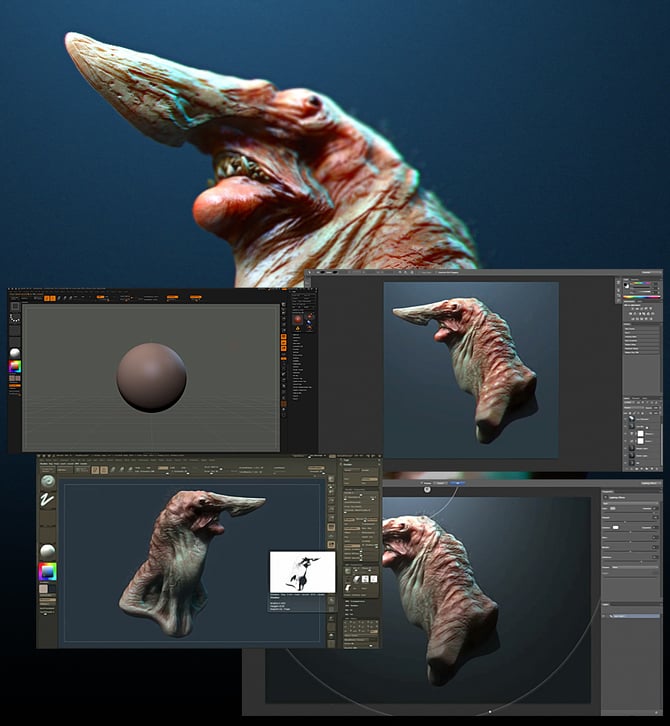 In this tutorial, I share my techniques in creating compelling monster busts. You will be shown the beginning stages of the development, covering the design stages in ZBrush, working with reference, and theories on how to create compelling creature busts.